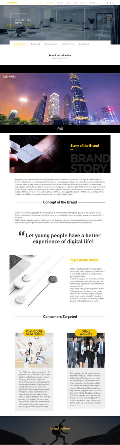 围绕移动电源网站设计风格,结合乔威品牌元素,网站设计主色系采用黄色,也符合移动电源网站设计调性。网站整体保持着清晰明了的设计风格