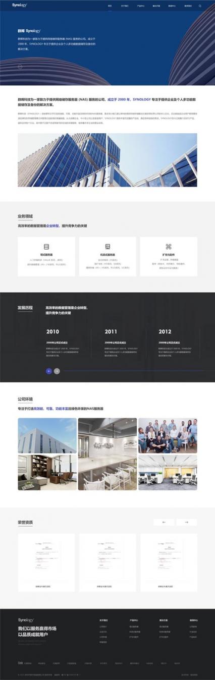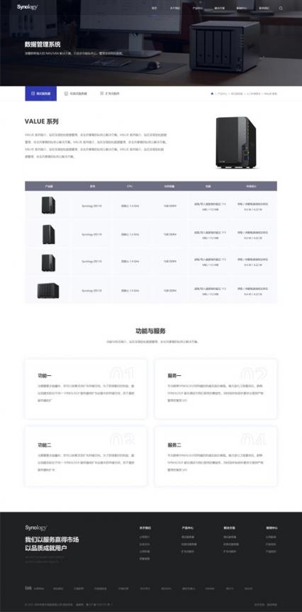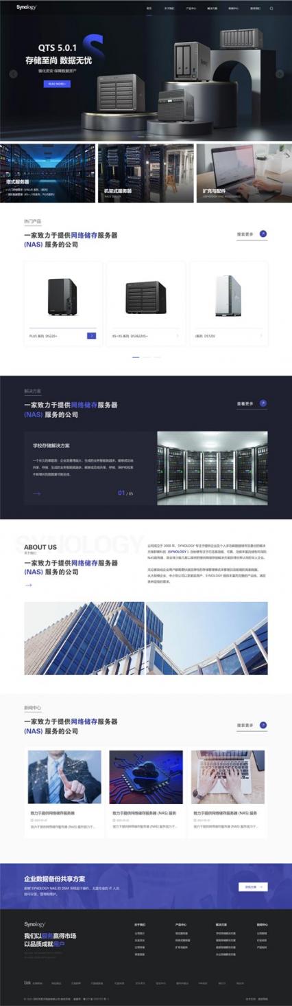 根据群晖科技的品牌属性及产品特性采用科技蓝为网站主题色,黑白灰为整站色系调性,既体现了企业产品特性网站简约大气厚重科技感满满,同时也体现了网络存储网站设计行业调性。